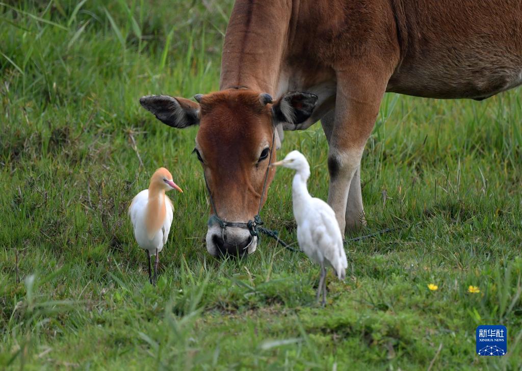 在闽江河口湿地里,一只黄牛与牛背鹭在草地里觅食(4月19日摄)。