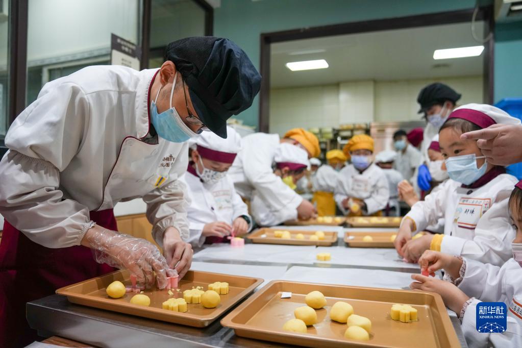 5月15日,在爱德面包坊,“喜憨儿”新程(左一)与前来参观的小朋友们一起制作绿豆糕。