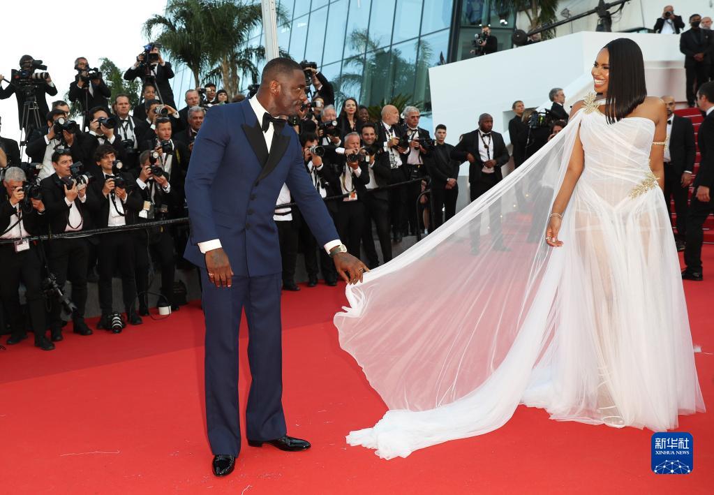 5月20日,在法国戛纳举行的第75届戛纳国际电影节上,演员伊德瑞斯·艾尔巴(左)和妻子抵达影片《三千年的渴望》首映式现场。