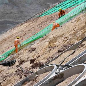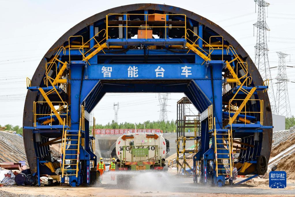 5月25日,在集大原高铁内蒙古丰镇段建设现场,中铁四局洒水车进行防尘作业。