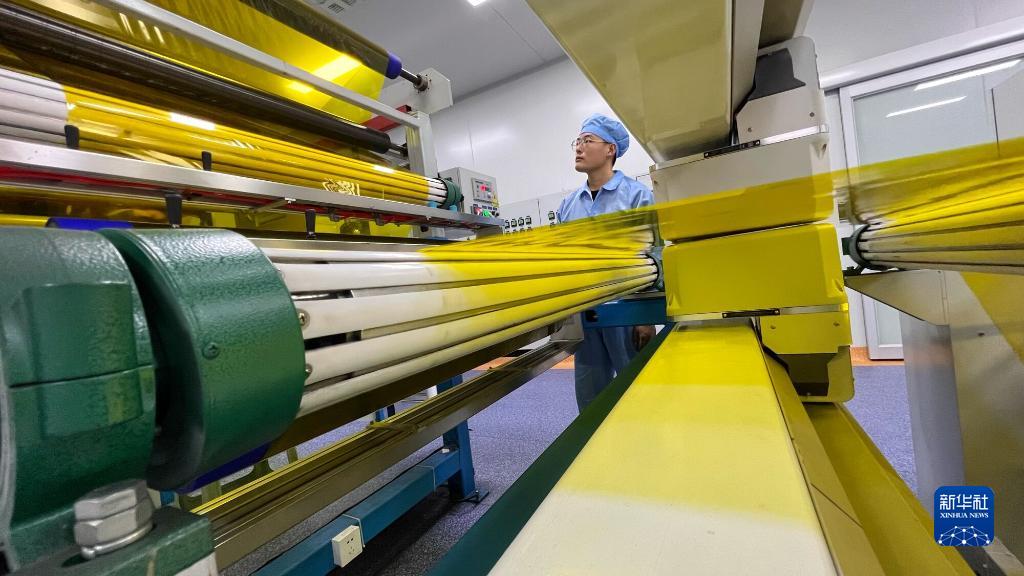 9月17日,在东营经济技术开发区欣邦电子科技有限公司聚酰亚胺薄膜生产车间,工人操作拉伸机对薄膜进行拉伸。