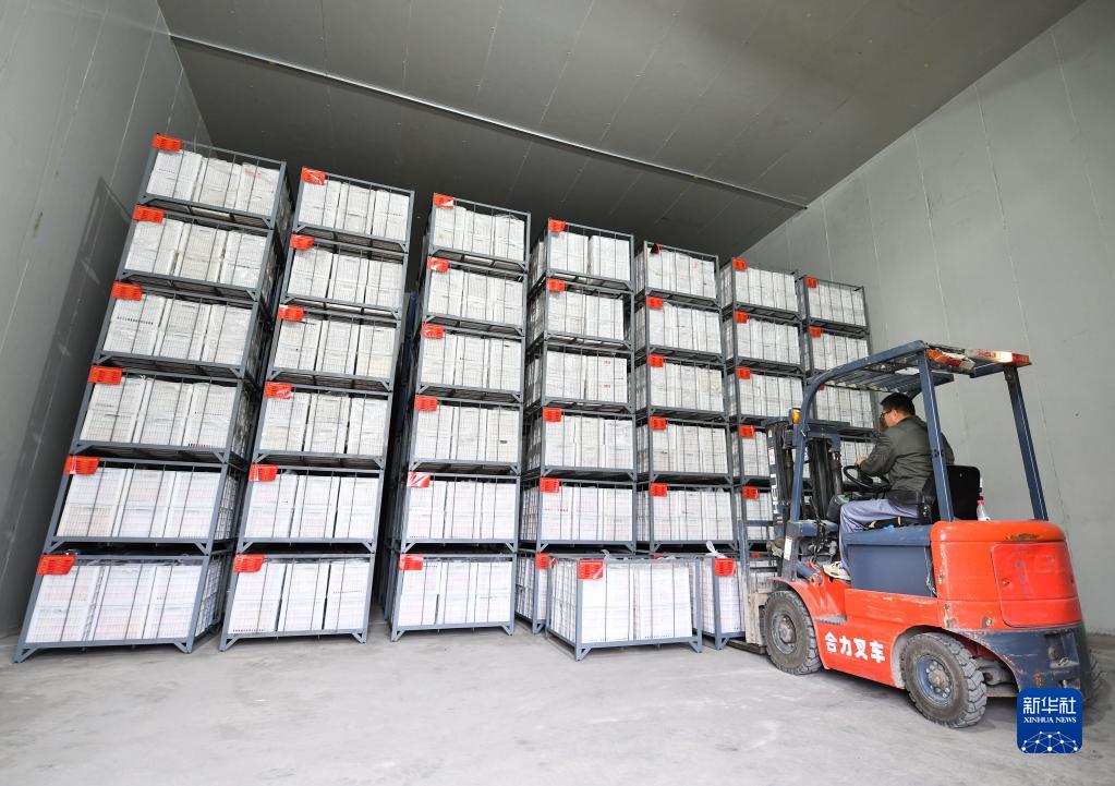 10月27日,在陕西省延安市安塞区南沟村,工作人员在冷库搬运苹果。 新华社记者 张博文 摄