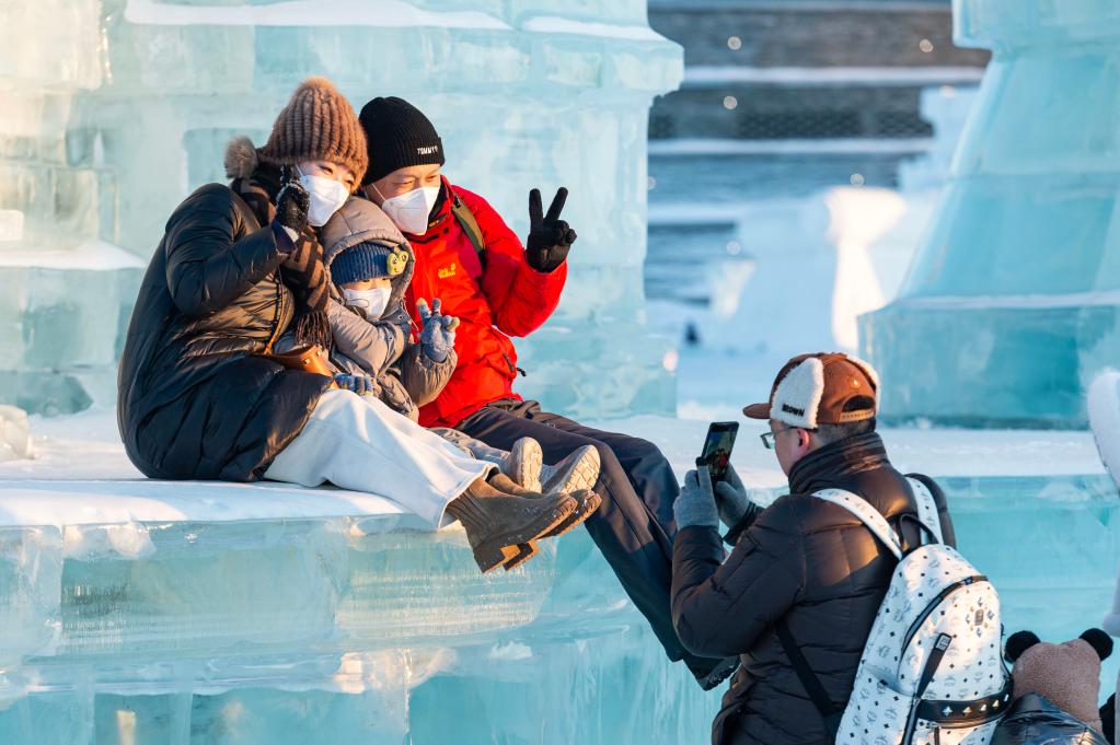 2月25日,游客在哈尔滨冰雪大世界园区游玩。