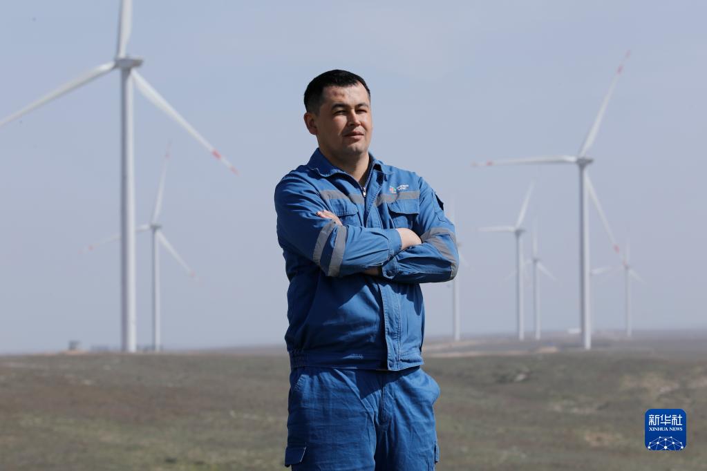 4月3日,在哈萨克斯坦札纳塔斯,阿比尔加济耶夫站在风电项目风机前。