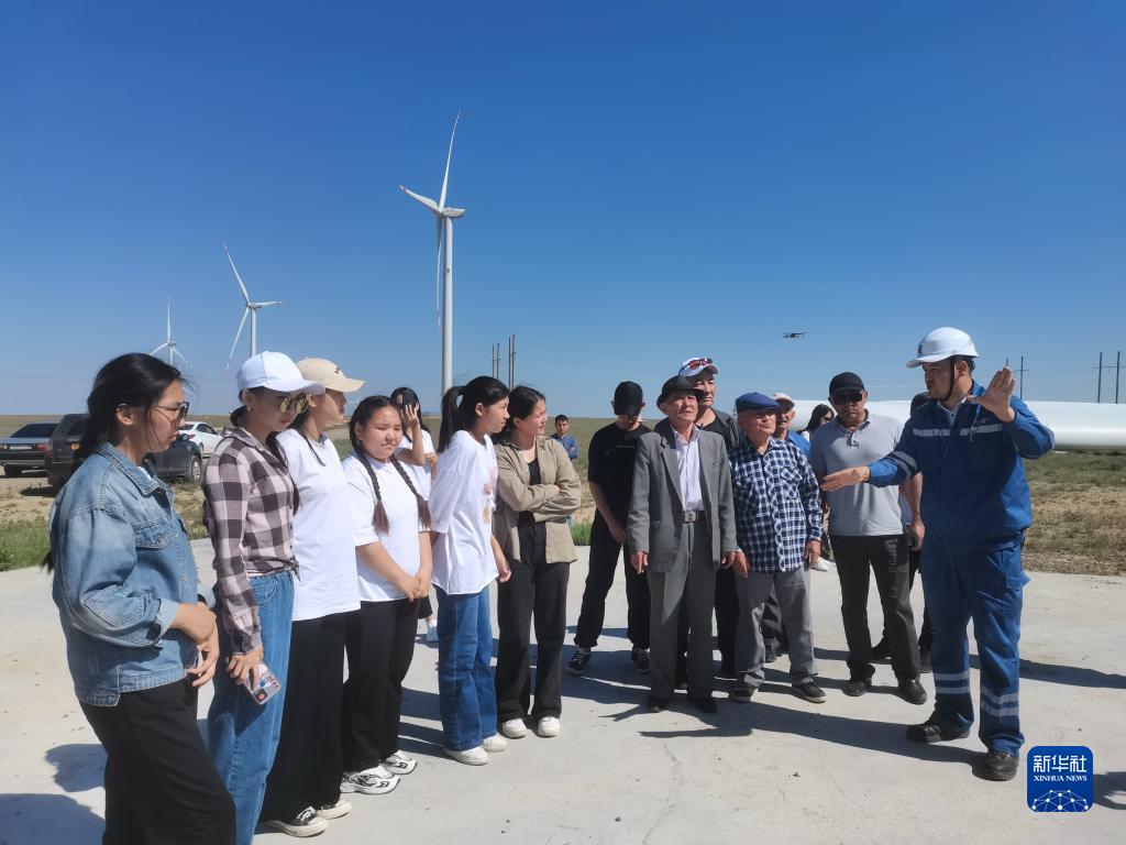 2022年5月15日,在哈萨克斯坦札纳塔斯,阿比尔加济耶夫(右一)给来风电场参观的人们讲解风力发电的优势与特性。