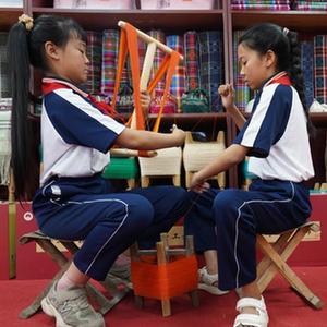 5月24日,小学生在河北省沙河市塔子峪村非遗传习所内体验四匹缯布制作技艺。