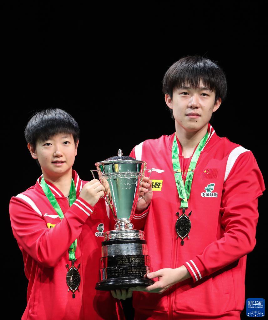 当日,2023年世界乒乓球锦标赛混合双打颁奖仪式在南非德班举行。中国组合王楚钦/孙颖莎以3比0战胜日本组合张本智和/早田希娜,夺得冠军。