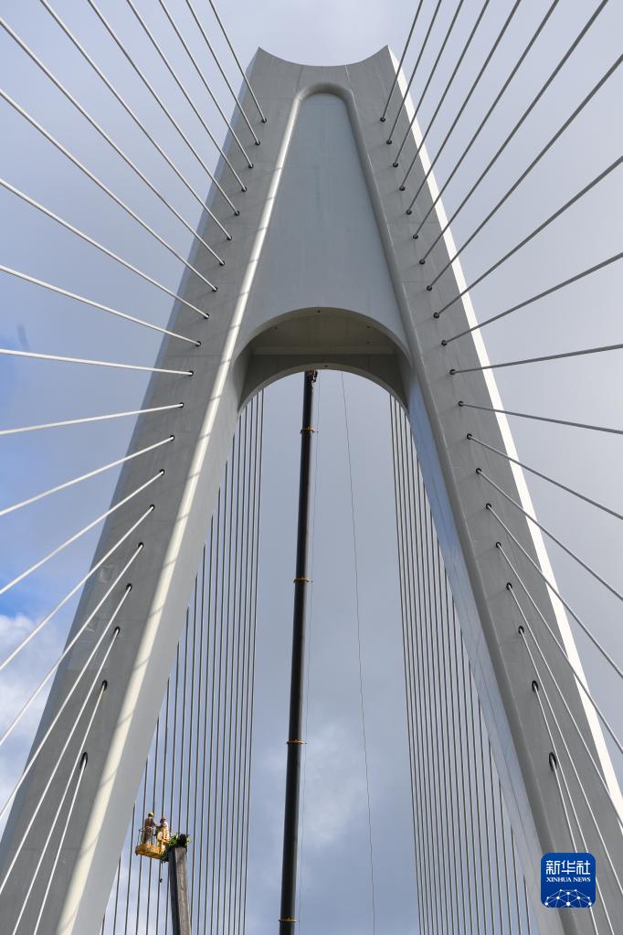 5月25日,建筑工人在鹭洲大桥上进行施工。