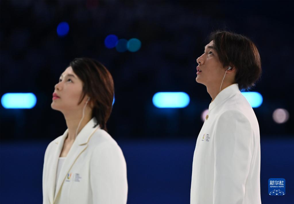7月28日,国际大学生体育联合会会旗执旗手苏翊鸣(右)和施廷懋在开幕式上。