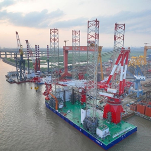 该风电安装平台长133.8米,型宽50米,型深11米,总重约28000吨,艉部右舷设2500吨绕桩式全回转起重机,适用于砂性土、粘性土或类似地质作业,主要用于15兆瓦及以上机组设备安装,可同时运载2套15兆瓦风机机组设备,最大作业水深70米。新华社发(许丛军 摄)