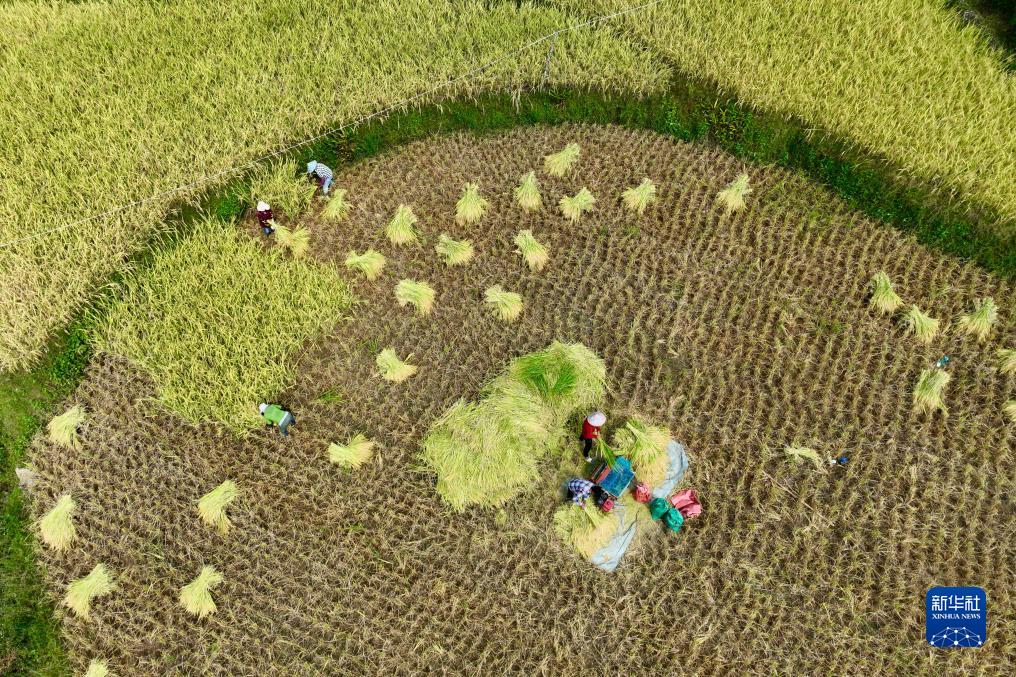中秋前后,福建省永泰县10多万亩水稻进入成熟收获期,一块块金黄色的稻田点缀在青山与传统村落之间,田间地头一派繁忙的秋收景象。