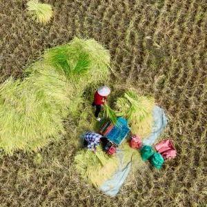 10月2日,福建省永泰县白云乡村民在收获水稻(无人机照片)。