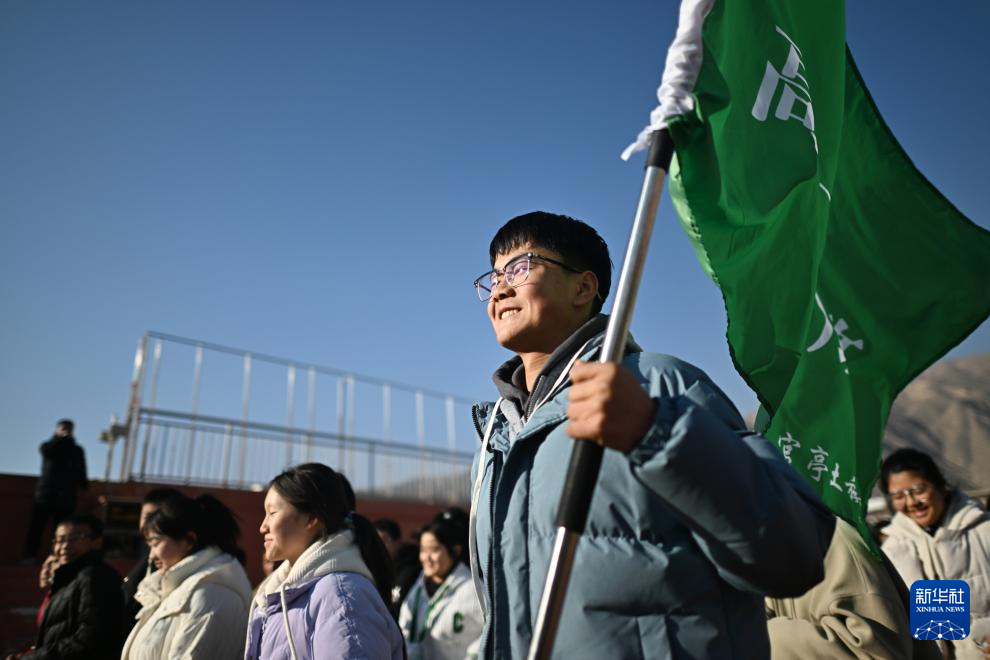 12月25日,来自民和县官亭镇土族中学的学生马忠林(前右)和同学们在民和县城西高级中学的操场上跑操。