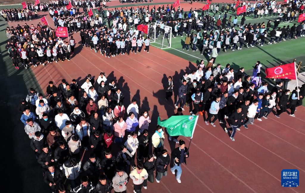 12月25日,来自民和县官亭镇土族中学的学生在民和县城西高级中学的操场上跑操(无人机照片)。