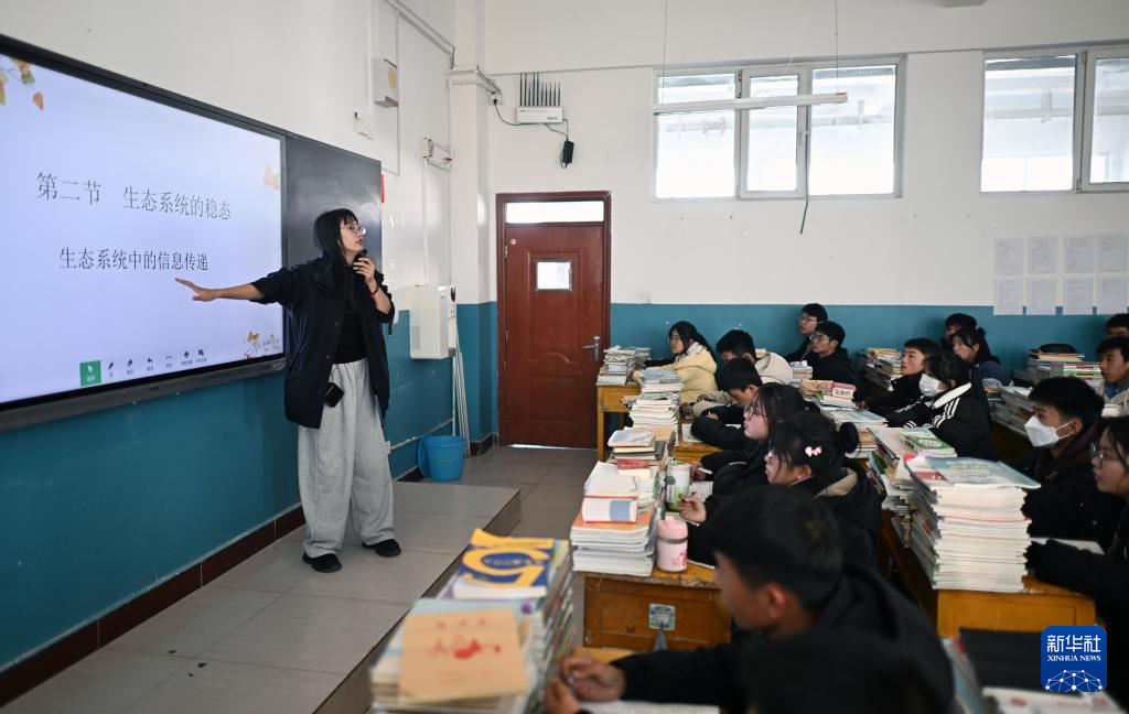 12月25日,民和县官亭镇土族中学教师郭玲玉(左一)在民和县第一中学的教室内授课。