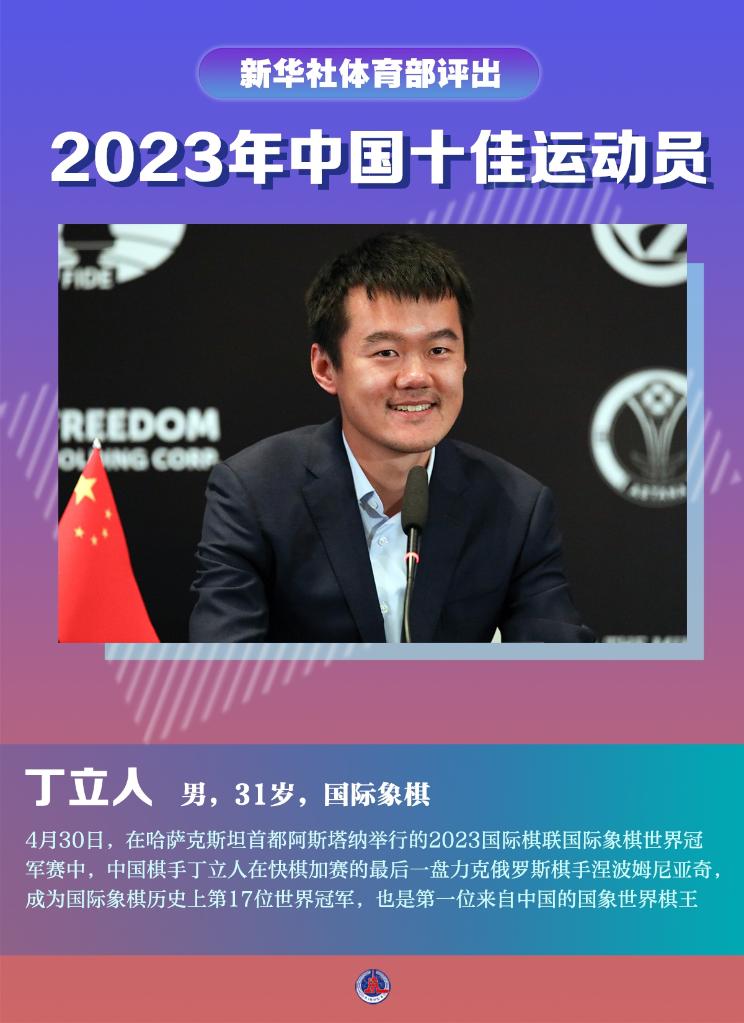 4月30日,在哈萨克斯坦首都阿斯塔纳举行的2023国际棋联国际象棋世界冠军赛中,中国棋手丁立人在快棋加赛的最后一盘力克俄罗斯棋手涅波姆尼亚奇,成为国际象棋历史上第17位世界冠军,也是第一位来自中国的国象世界棋王。