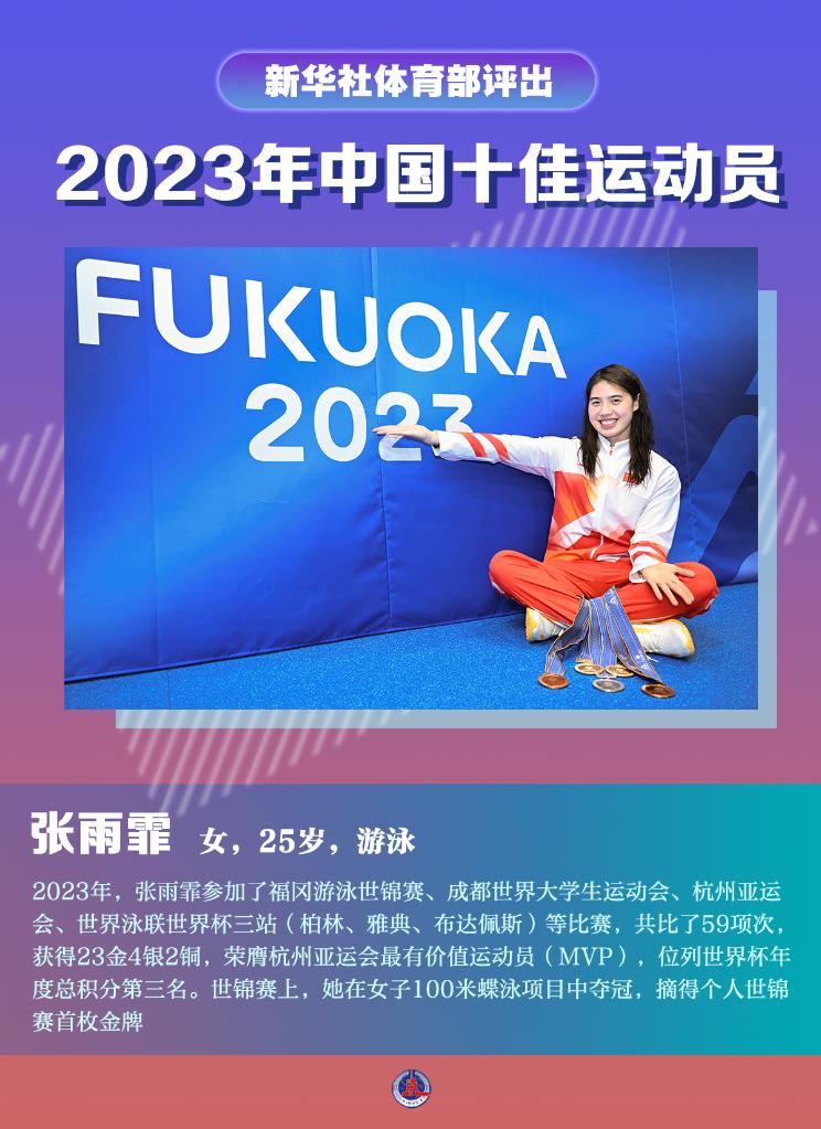 2023年,张雨霏参加了福冈游泳世锦赛、成都世界大学生运动会、杭州亚运会、世界泳联世界杯三站(柏林、雅典、布达佩斯)等比赛,共比了59项次,获得23金4银2铜,荣膺杭州亚运会最有价值运动员(MVP),位列世界杯年度总积分第三名。世锦赛上,她在女子100米蝶泳项目中夺冠,摘得个人世锦赛首枚金牌。