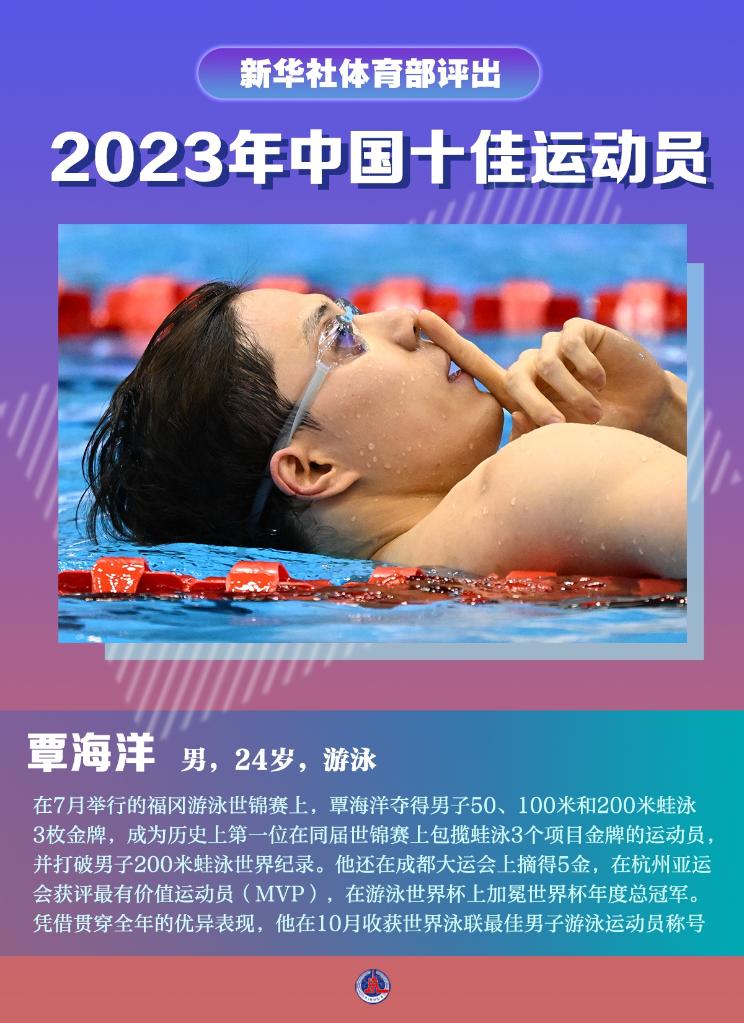 在7月举行的福冈游泳世锦赛上,覃海洋夺得男子50、100米和200米蛙泳3枚金牌,成为历史上第一位在同届世锦赛上包揽蛙泳3个项目金牌的运动员,并打破男子200米蛙泳世界纪录。他还在成都大运会上摘得5金,在杭州亚运会获评最有价值运动员(MVP),在游泳世界杯上加冕世界杯年度总冠军。凭借贯穿全年的优异表现,他在10月收获世界泳联最佳男子游泳运动员称号。