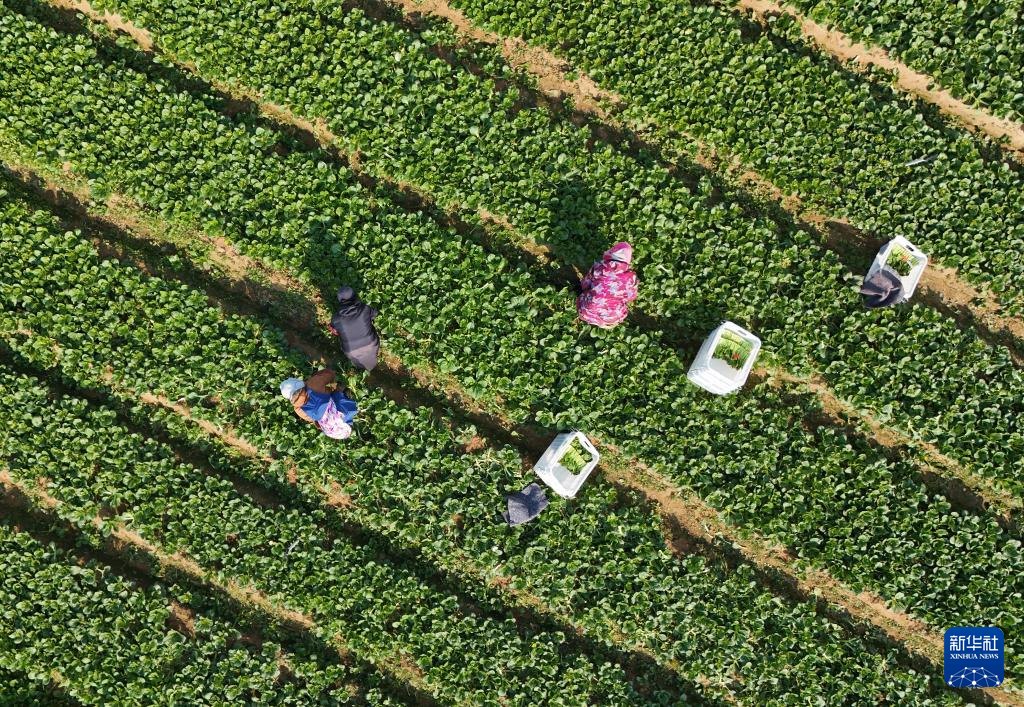 12月27日,工人在鹿寨县江口乡丹竹村蔬菜种植示范基地采收蔬菜(无人机照片)。