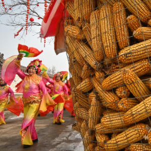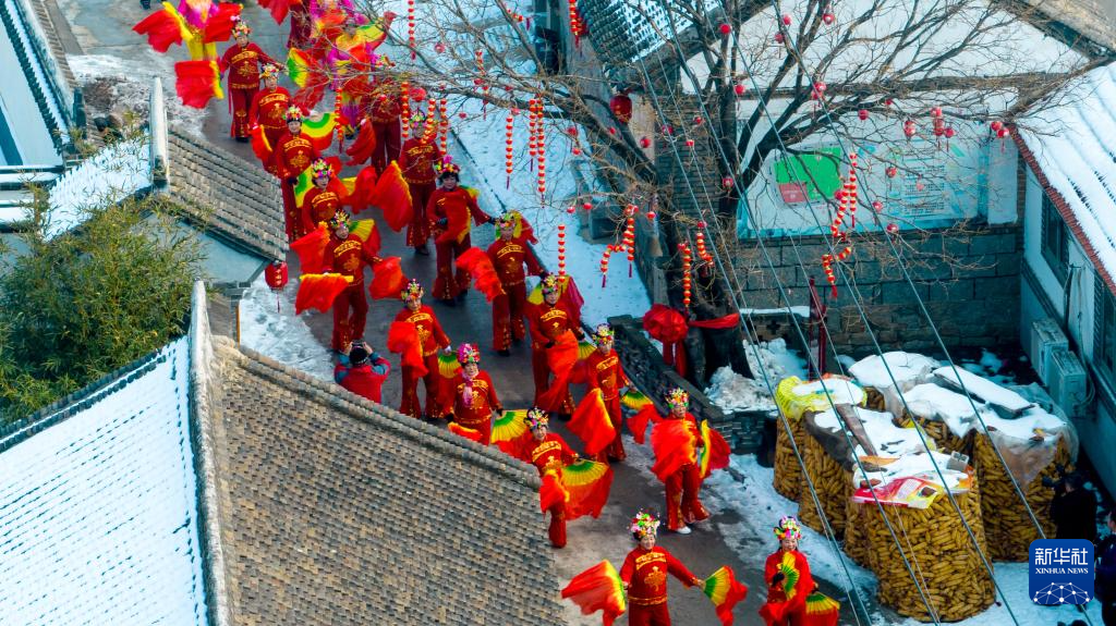 12月28日,在龙口市黄山馆镇馆前后徐村,秧歌队为游客表演(无人机照片)。