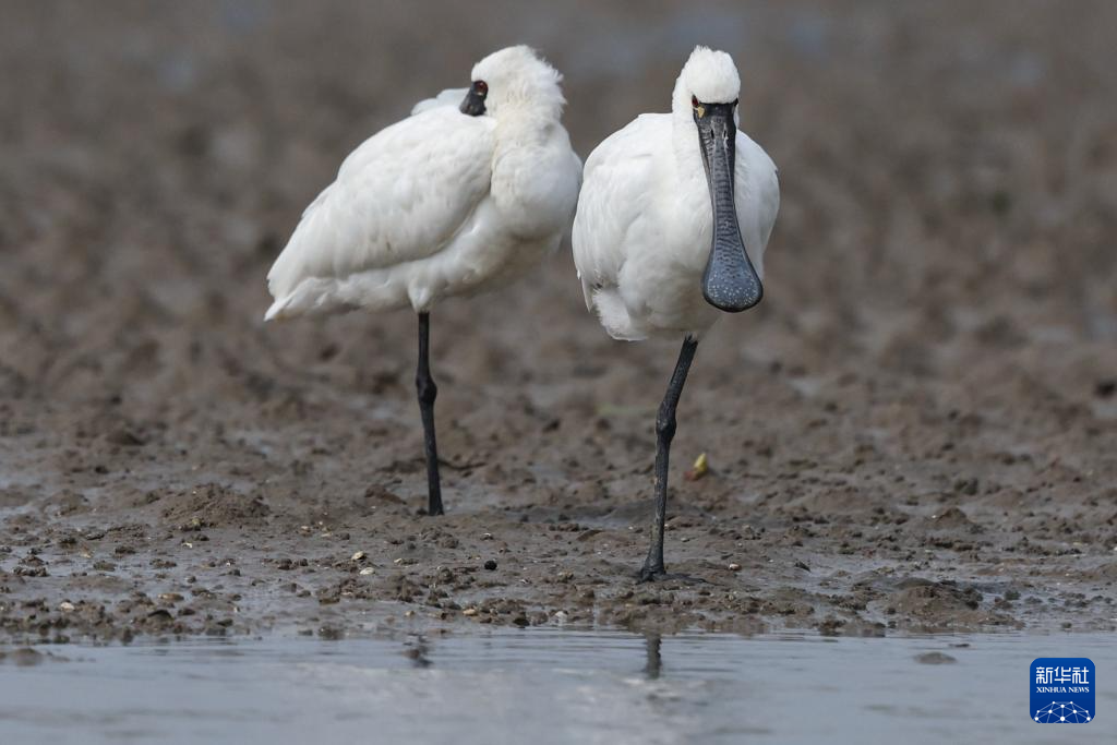 两只黑脸琵鹭在海南新盈红树林国家湿地公园休憩(12月27日摄)。