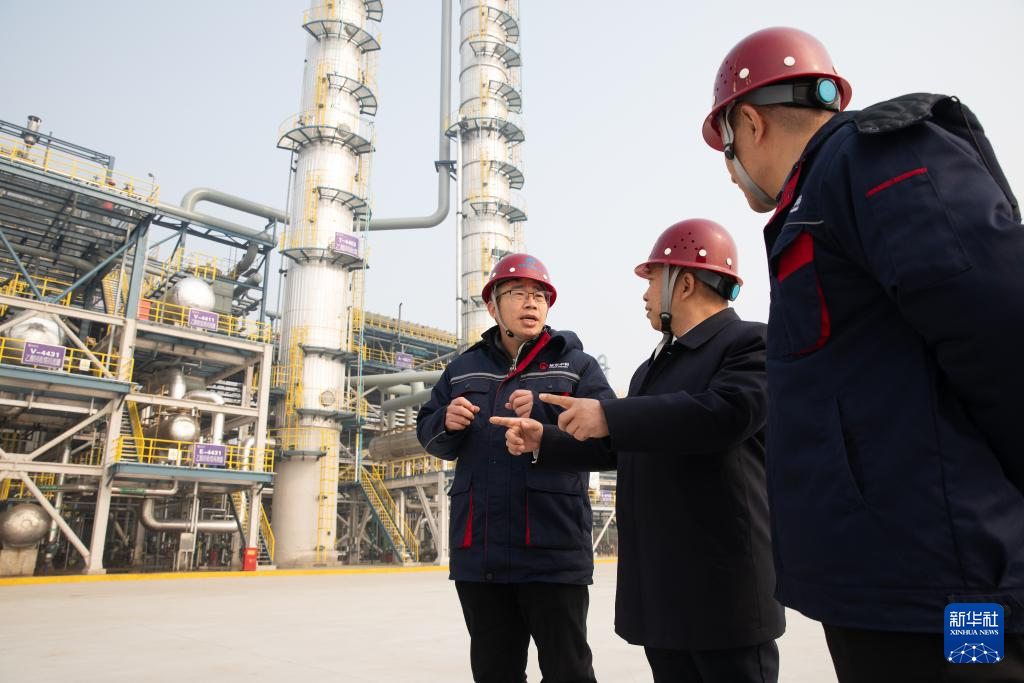 12月28日,在淮北矿业集团碳鑫科技有限公司,刘中民院士(中)和工作人员在交流装置建设和运行情况。