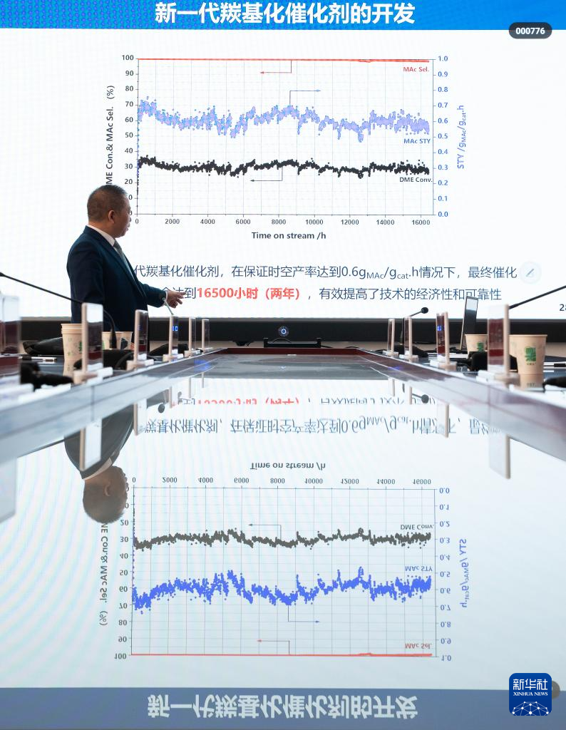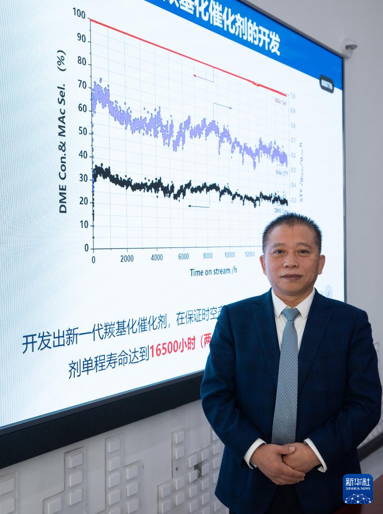 12月28日,在淮北矿业集团碳鑫科技有限公司,刘中民院士在会议室向媒体介绍升级催化剂的研究进展。