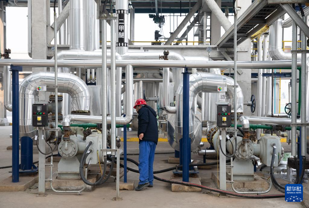 12月28日,在淮北矿业集团碳鑫科技有限公司,工作人员在调试60万吨/年乙醇生产装置设备。