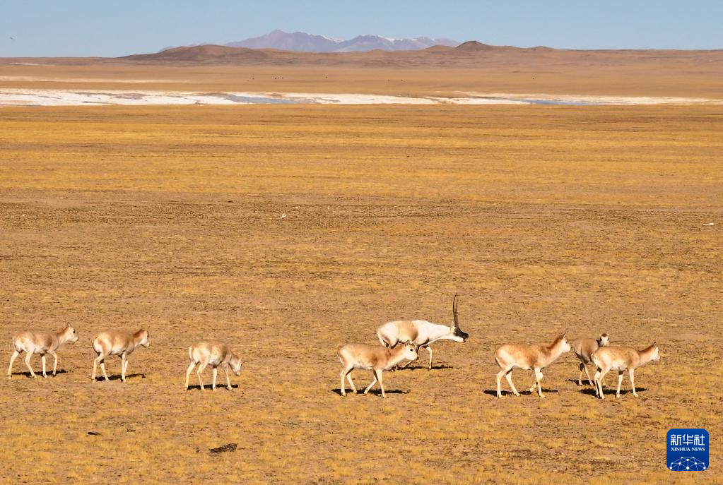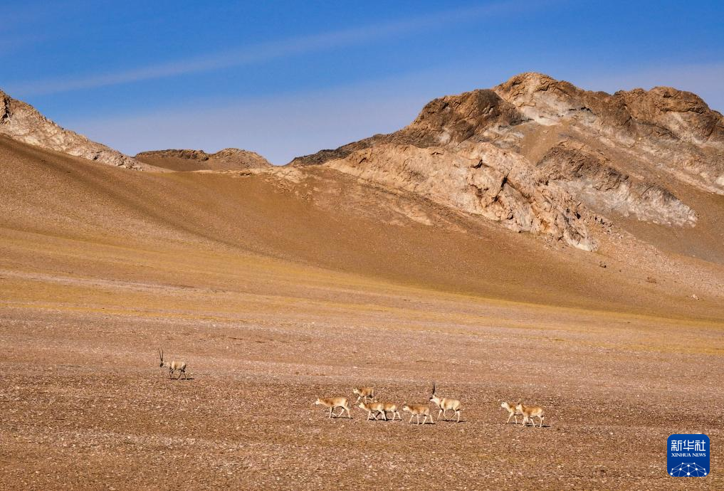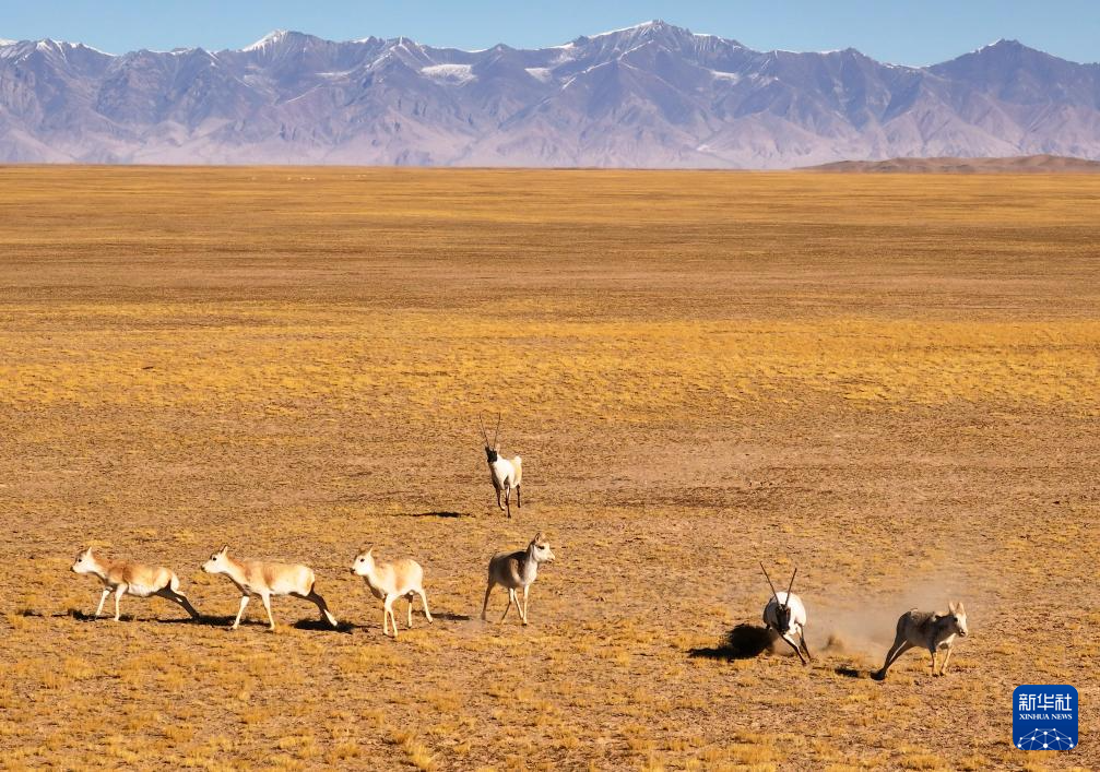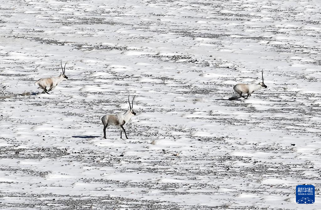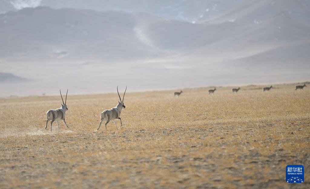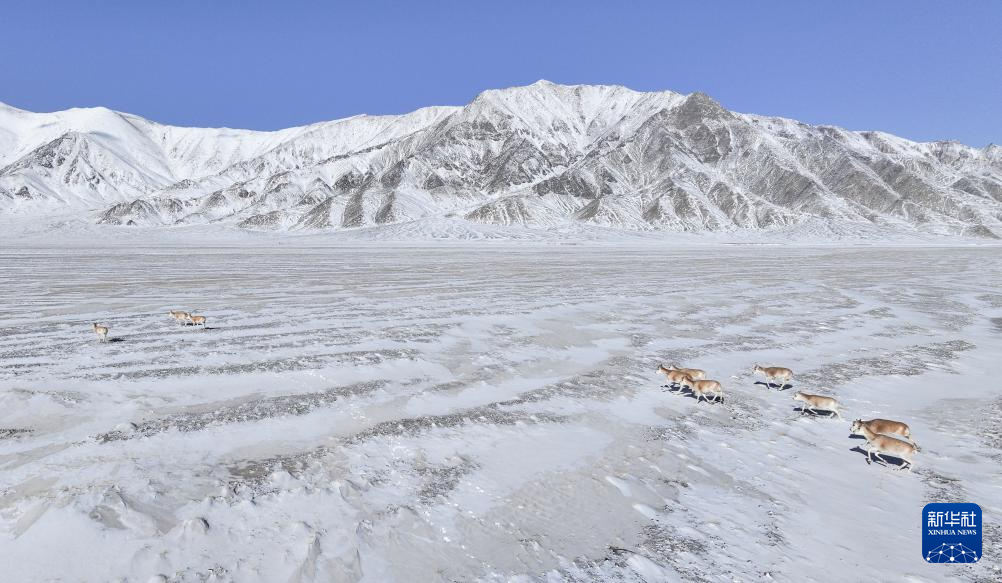 阿尔金山国家级自然保护区,两只公藏羚追逐一群母藏羚(12月19日摄)。