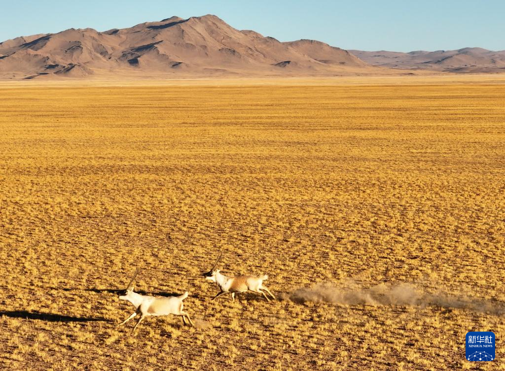 阿尔金山国家级自然保护区,两只公藏羚在追逐、打斗(无人机照片,12月22日摄)。