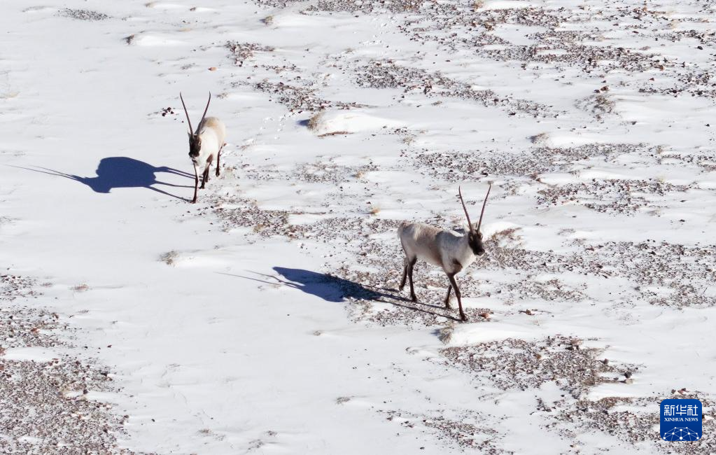 阿尔金山国家级自然保护区,两只公藏羚在寻找母藏羚(无人机照片,12月18日摄)。