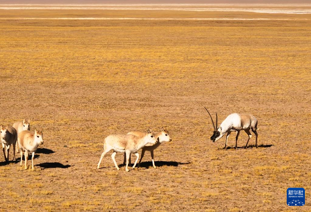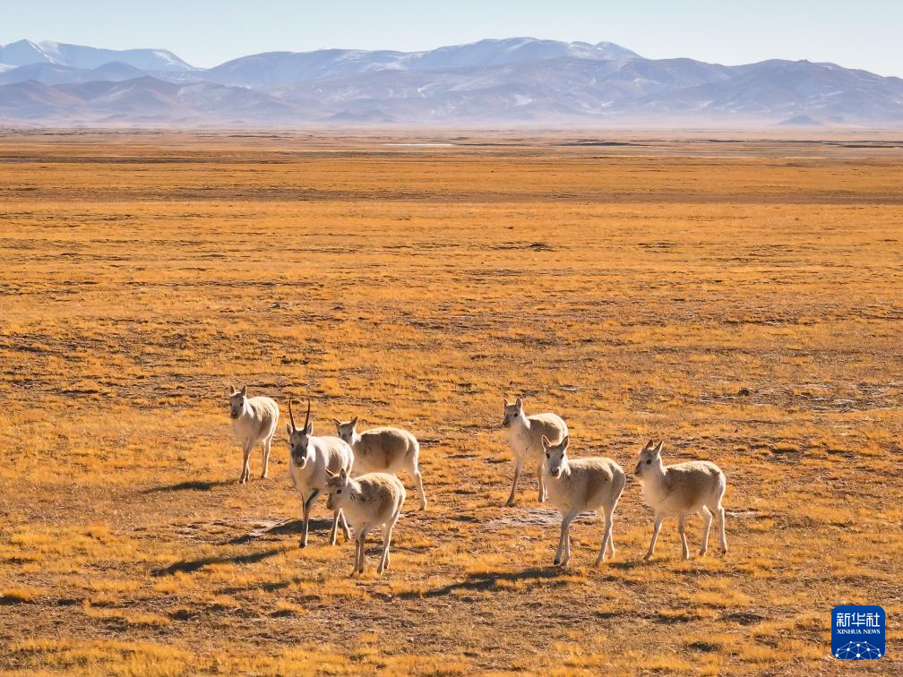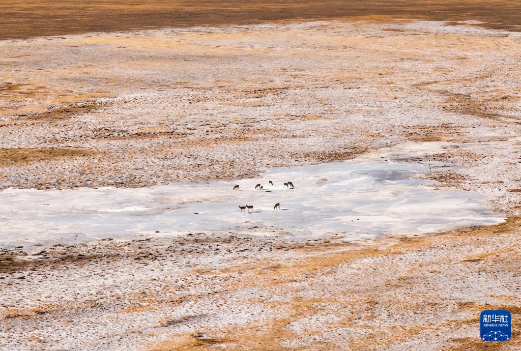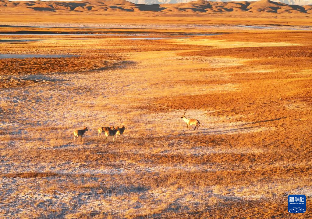 阿尔金山国家级自然保护区,一只公藏羚带着四只母藏羚觅食(无人机照片,12月22日摄)。