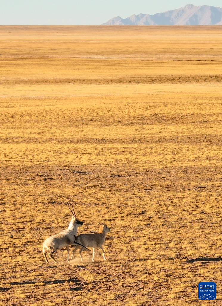 阿尔金山国家级自然保护区,一对进入交配状态的藏羚(无人机照片,12月22日摄)。