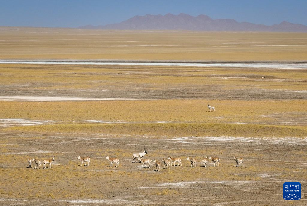 阿尔金山国家级自然保护区,藏羚在草原上觅食(无人机照片,12月19日摄)。