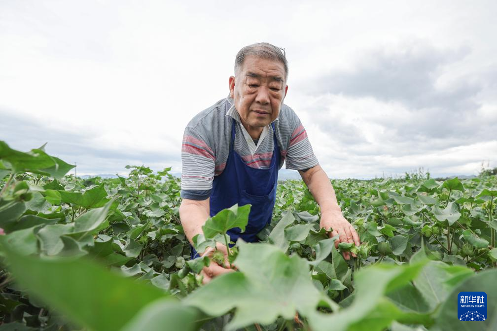12月29日,棉花育种专家赵国忠在海南三亚国家南繁科研育种基地检查棉花生长情况。