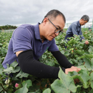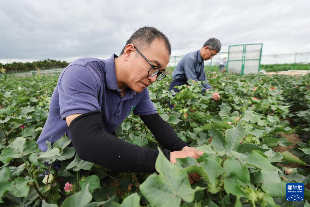 12月29日,石家庄农科院的科研人员在海南三亚国家南繁科研育种基地给棉花做杂交实验。