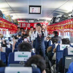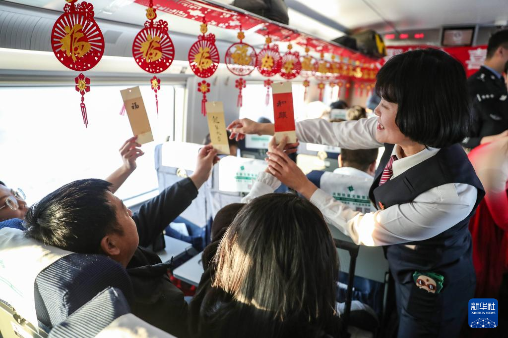 1月1日,在沈阳南站开往北京朝阳站的G980次列车上,中国铁路沈阳局集团有限公司沈阳客运段动车三队的乘务人员与乘客互动。