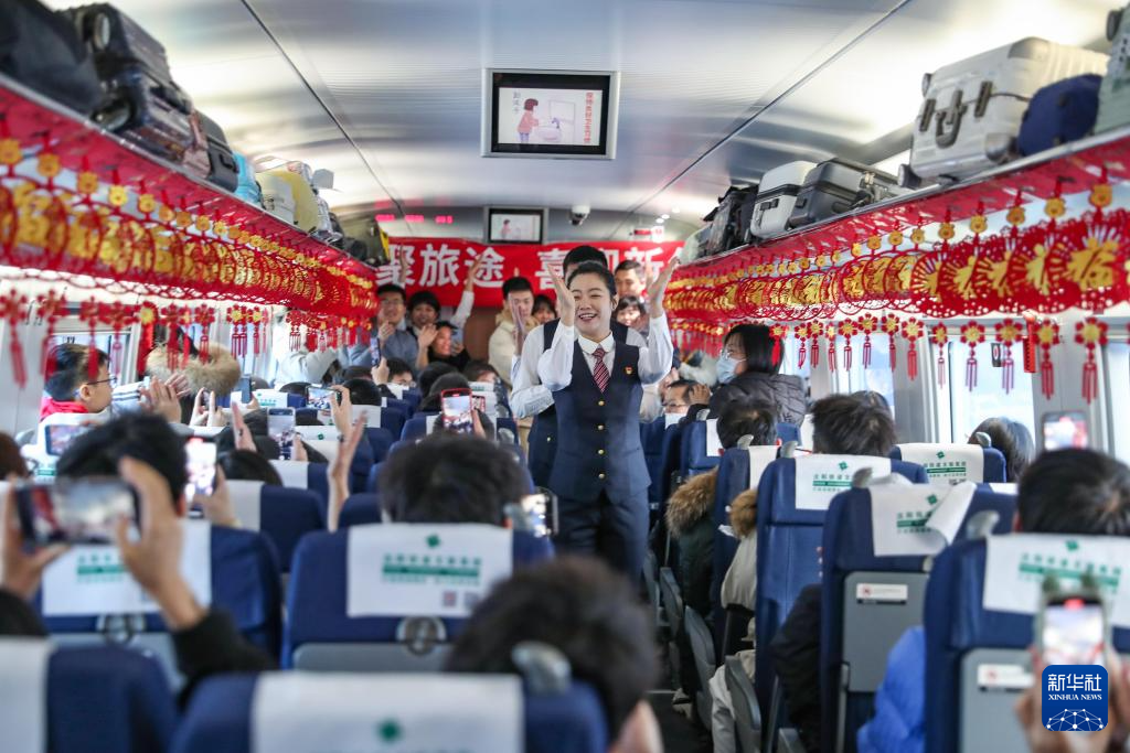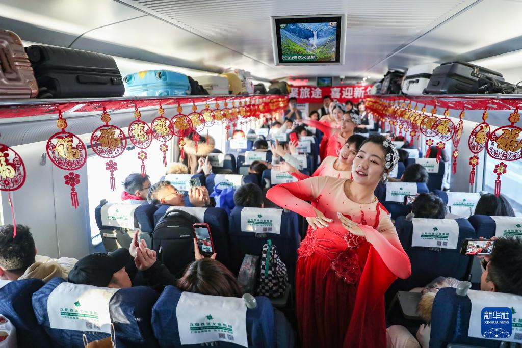 1月1日,在沈阳南站开往北京朝阳站的G980次列车上,中国铁路沈阳局集团有限公司沈阳客运段动车三队的乘务人员为乘客表演节目。