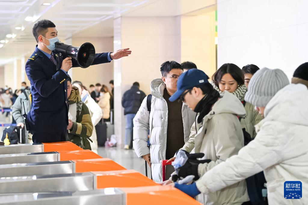 1月1日,哈尔滨火车站值班人员引导乘客有序通过闸机。