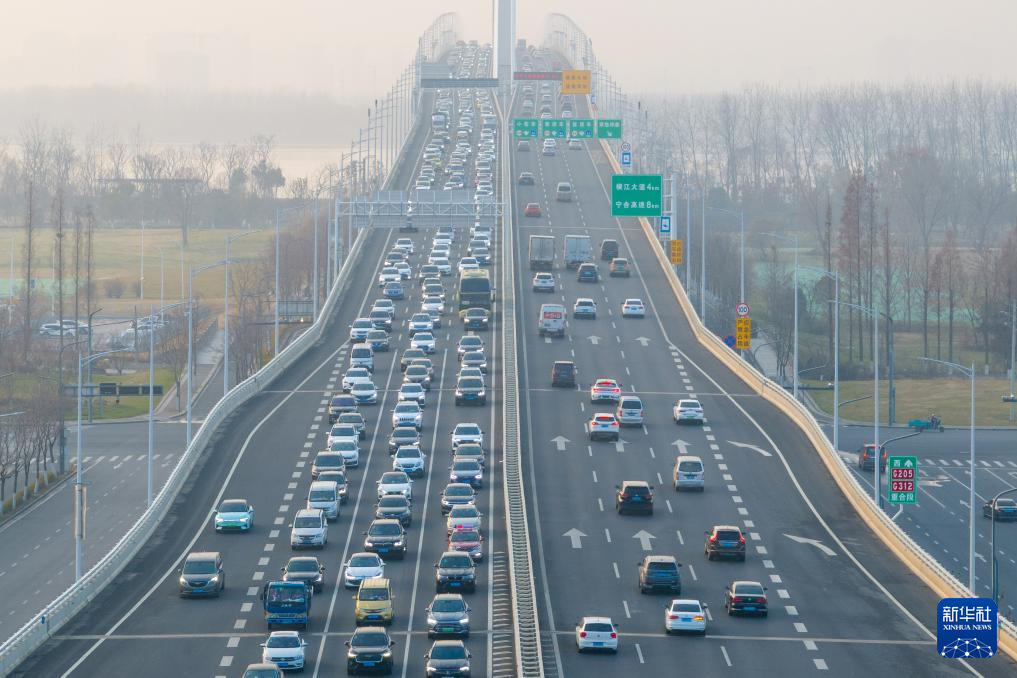 1月1日拍摄的南京江心洲长江大桥上的车流(无人机照片)。