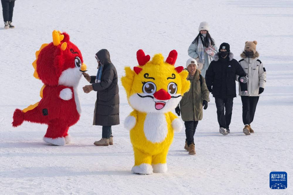 1月1日,在哈尔滨太阳岛雪博会园区,工作人员与游客互动。