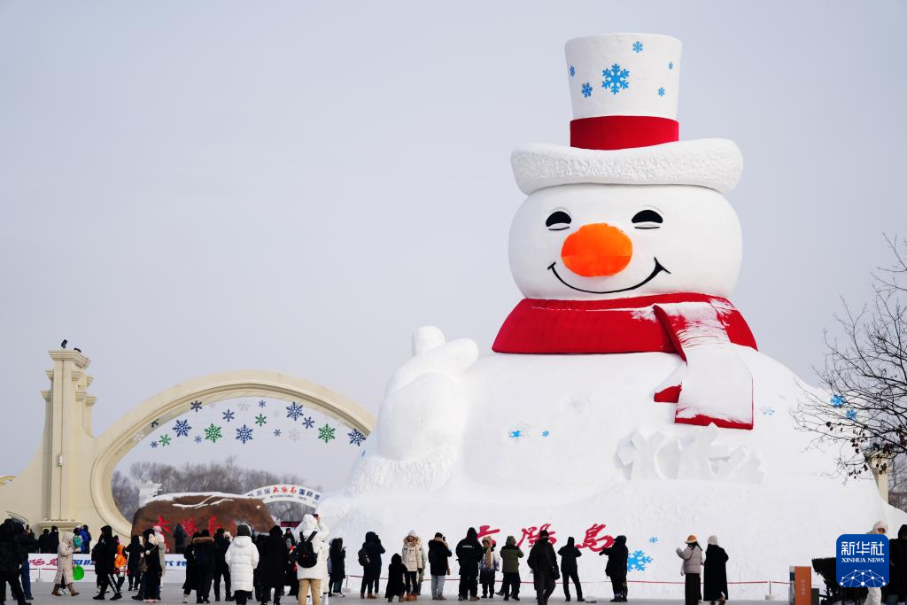 1月1日,在哈尔滨市群力音乐公园,众多游客前来与雪人合影(无人机照片)。