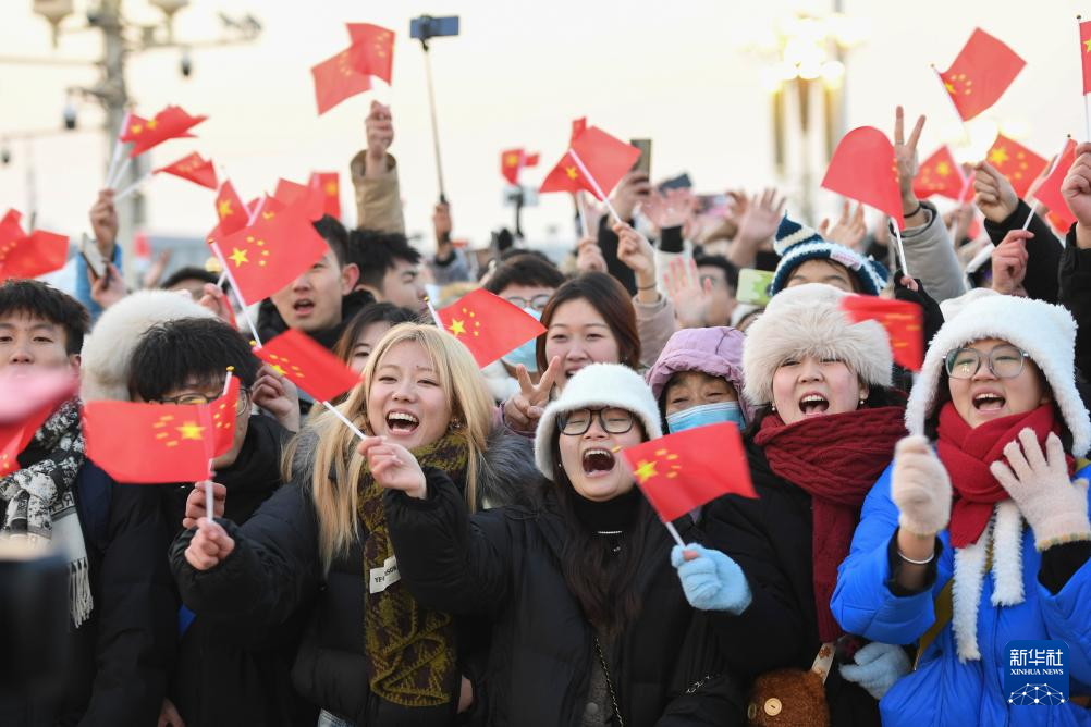 1月1日晨,北京天安门广场举行隆重的升国旗仪式。这是观众在升旗仪式结束后欢呼。