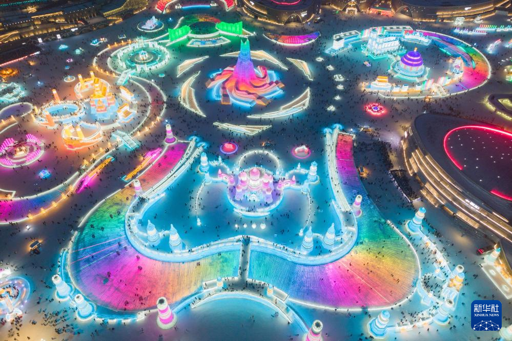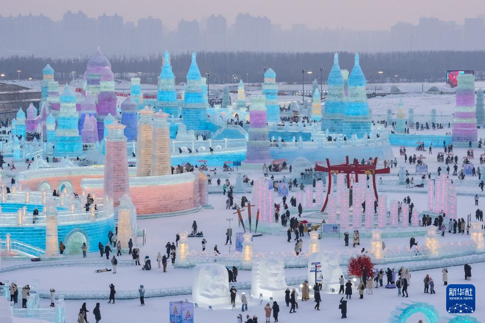 1月1日,游客在哈尔滨冰雪大世界园区内游玩(无人机照片)。