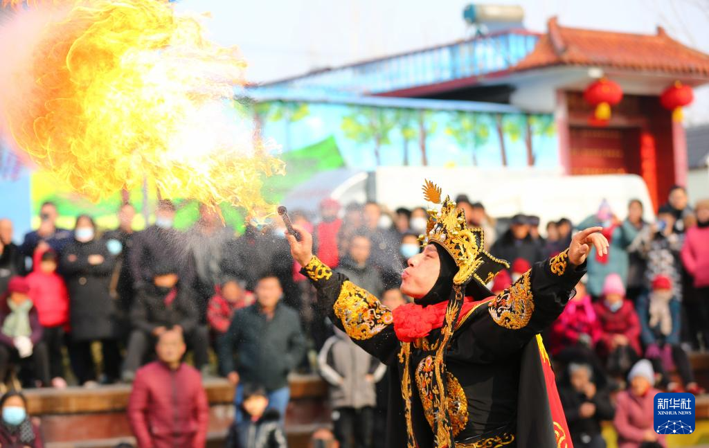 1月1日,在山东省滕州市西岗镇,民间艺人在表演“喷火”绝活。
