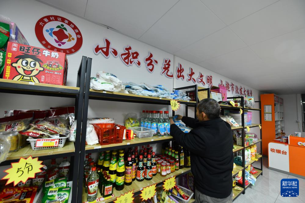 1月5日,在融安县浮石镇六寮村,村民在积分超市兑换奖品。