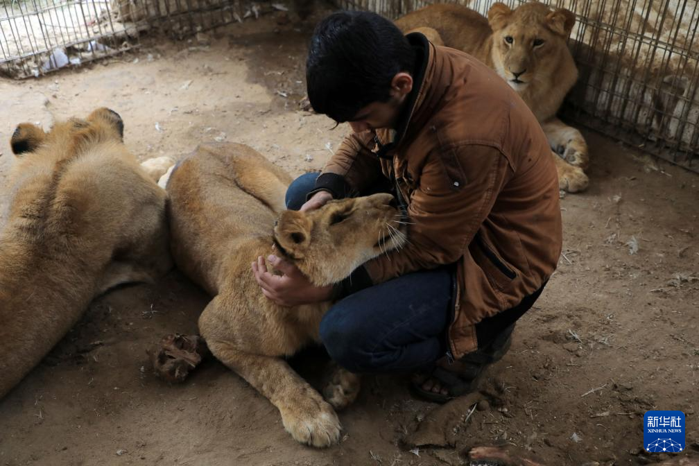 2024年1月2日,在加沙地带南部城市拉法一动物园内,工作人员查看狮子的身体情况。