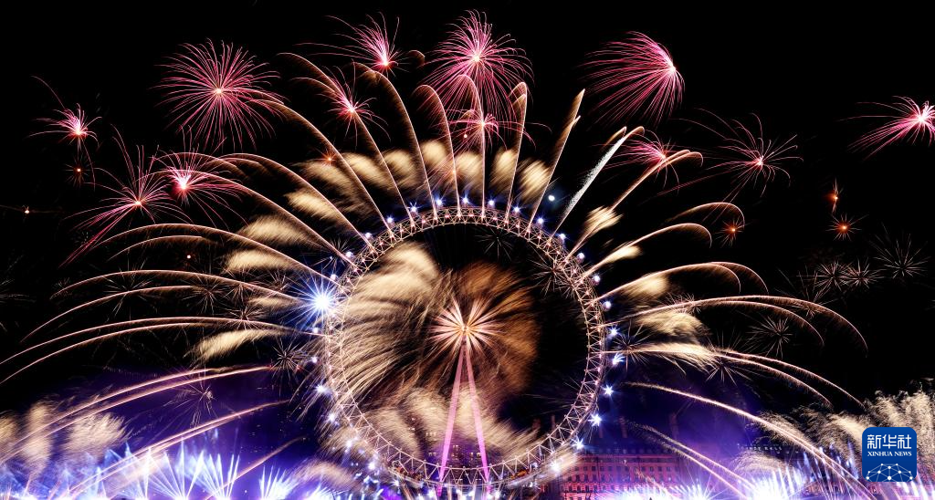 2024年1月1日凌晨,新年焰火在英国伦敦的伦敦眼上空绽放。
