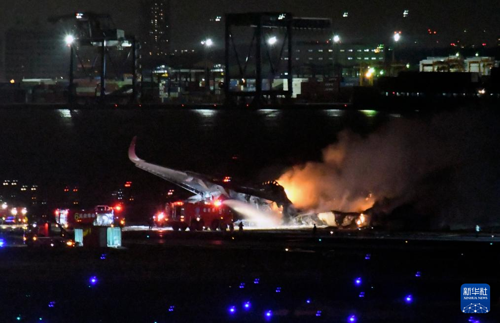 2024年1月2日,消防员在日本东京羽田国际机场的客机起火事故现场进行灭火。
