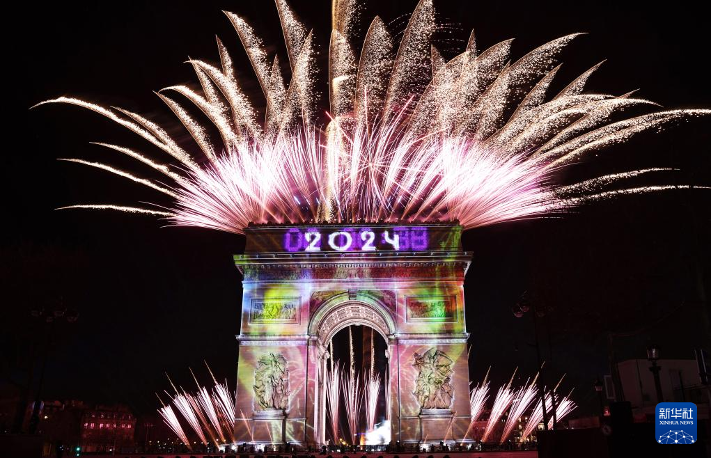 2023年12月31日晚,法国巴黎凯旋门上空焰火绽放,迎接新年到来。
